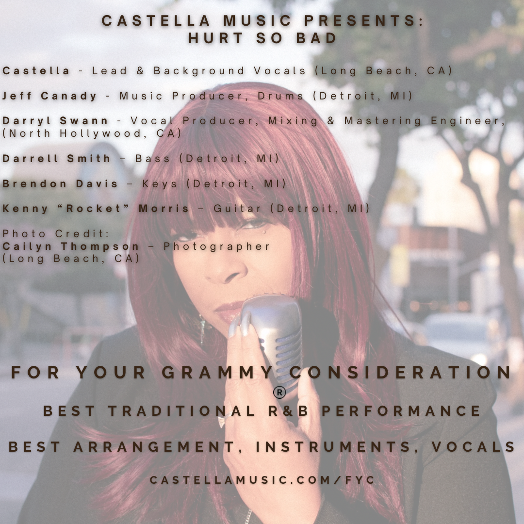 Castella teamed up with her production team of Jeff Canady (Detroit, MI) #1 Billboard charting producer & Darryl Swann (Los Angeles, CA) Grammy Award winning record producer for another hit record from the upcoming EP “A Couple of Covers”. Castella received her second Indie Soul Award and #1 chart topping success in the US, Canada, Spain & Italy with Nights Over Egypt, which was also produced by Castella's production team of Jeff Canady and Darryl Swann. Jeff created an amazing track which included renowned Detroit musicians. Starting with Brendon Davis on Keys and String Arrangements (a fresh new talent, who likens the style of George Duke), Kenny “Rocket” Morris on Guitar, Darrell Smith (RIP) on Bass and Jeff Canady on Drums. Darryl Swann rounded out the instrumentation with his production of Orchestral Percussion, which added drama to the track, to great excitement for Castella. “It added an element of emotion that will capture the listener at just the right moments” she says. Darryl Swann has over 30 years in the recording industry and is credited for inspiring Castella to pursue a recording career. He served as Vocal Engineer, Mixing/Mastering Engineer and Record Producer on Hurt So Bad, as well as most of Castella's music. Recording vocals in North Hollywood, Castella opens up and embodies the raw emotion of the lyric of the song while paying homage to the classic tune, bringing a soulful, heartfelt style of singing to the forefront once again with her powerful vocals and ability to emote the pain of wanting and losing the one you love. Castella again, showcases her ability to belt a song for us as well as swoon us with luscious harmonies and a sweet softness as she doubles as her own background singer once again.